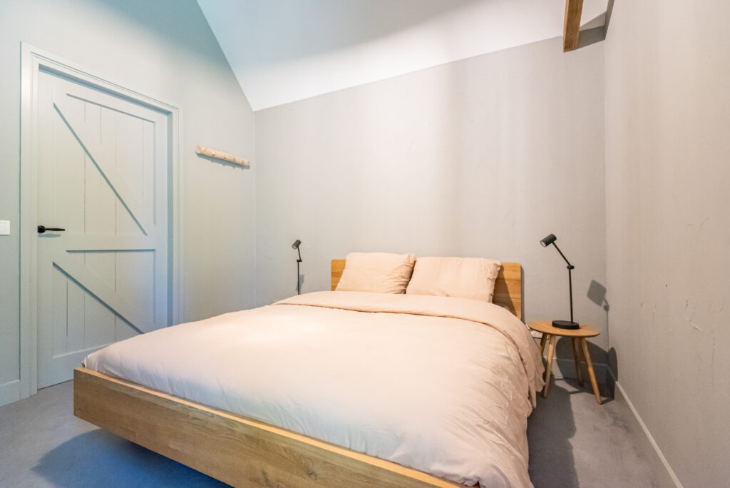 De trap brengt je naar boven, het bruggetje verbind de 2 slaapkamers en geeft zicht naar beneden op het kookeiland, de beide slaapkamers hebben 2 ingebouwde bedden, waar eventueel 3 kids per kamer kunnen slapen. Het huis is geschikt voor 1 gezin, met twee stellen of fijn met zijn twee.